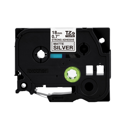 Cinta laminada Brother con extra adhesivo texto negro sobre cinta plata matte de 18mm x 8m