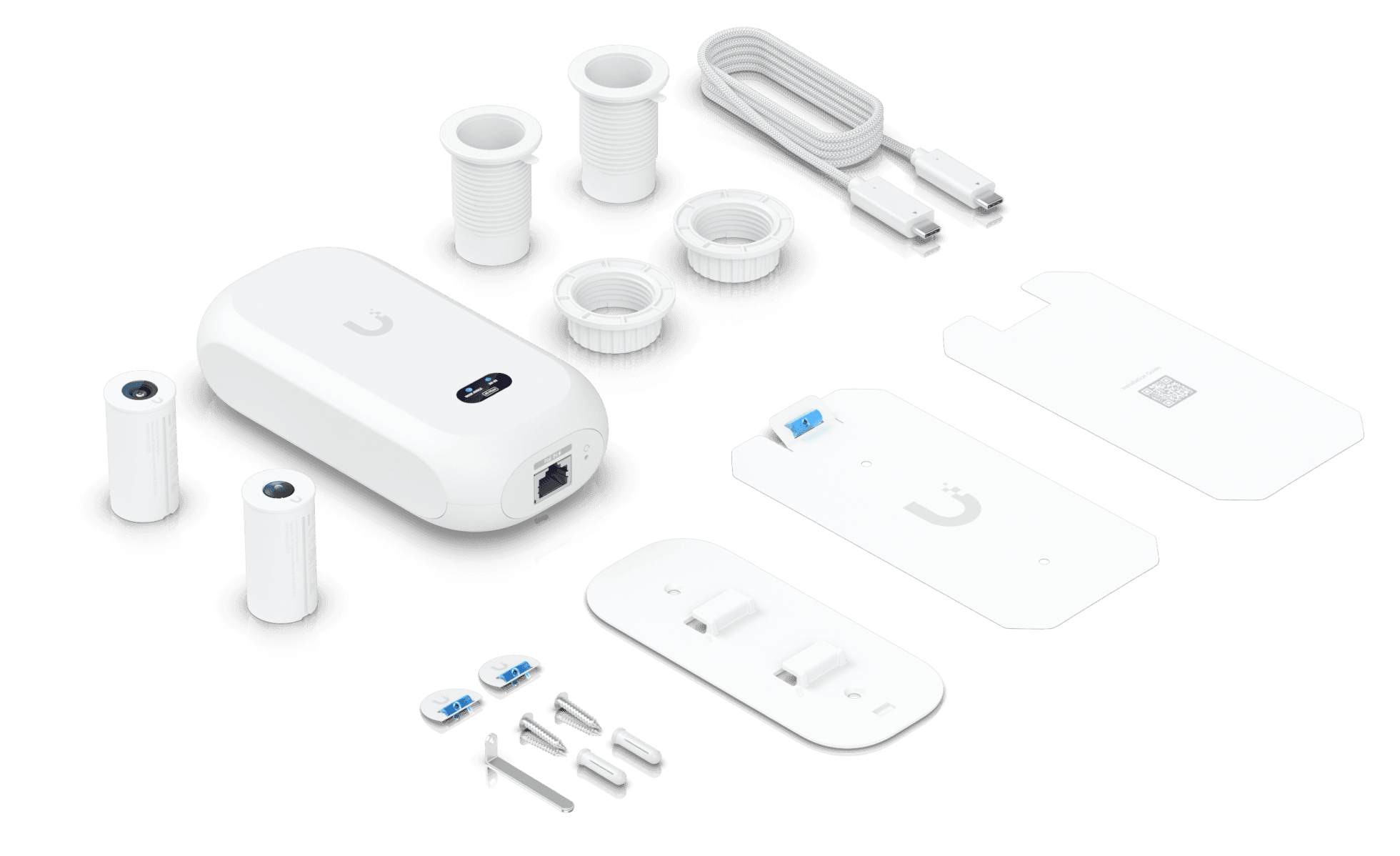 El kit incluye (1) AI Theta Hub, (1) Wide-Angle Lens, (1) 360 Lens y (2) Standard Flush Mounts